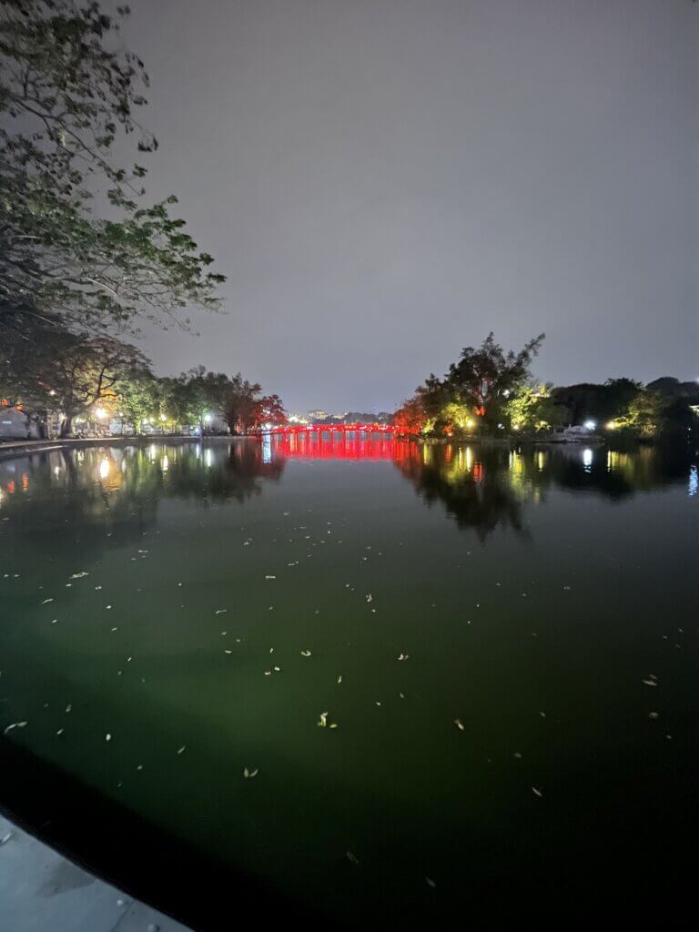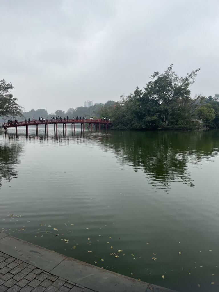 ハノイ旧市街にあるホアンキエム湖。シンボルの赤い橋がかかってます。