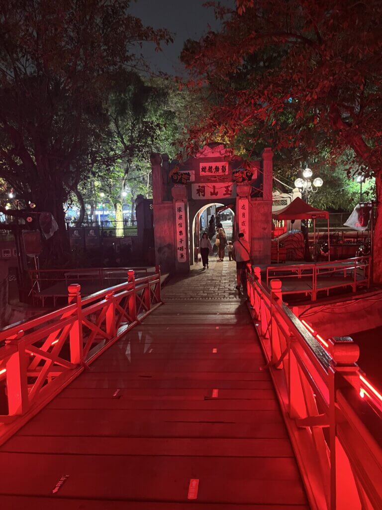 ハノイ旧市街にあるホアンキエム湖。シンボルの赤い橋がかかってます。